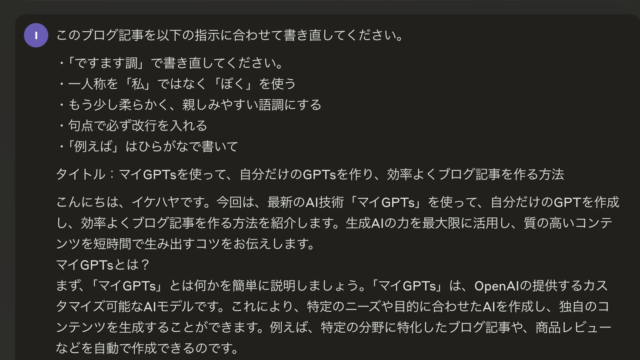 こっからは楽しいですよ。GPTsに指示を出して、原稿を書いてもらいましょう!
