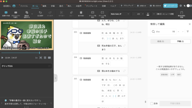 続いてキャプション入れです。ぼくはVREWに課金して、サクッと処理してます。